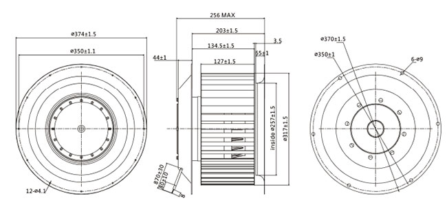 單進(jìn)風(fēng)前傾式離心風(fēng)機(jī)根據(jù)風(fēng)機(jī)外形可分為蝸殼前傾式離心風(fēng)機(jī)和常規(guī)前傾式離心風(fēng)機(jī)兩種。蝸殼前傾式離心風(fēng)機(jī)共有120mm,133mm,140mm,150mm,160mm,180mm六種風(fēng)機(jī)。常規(guī)前傾式有200mm,225mm,250mm,280mm,315mm,355mm,400mm,450mm八種風(fēng)機(jī)。