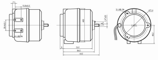 | 型號(hào) | 額定電壓 | 頻率 | 輸入功率 | 輸出功率 | 額定電流 | 轉(zhuǎn)速 | 轉(zhuǎn)向 | A mm | B mm | C mm |